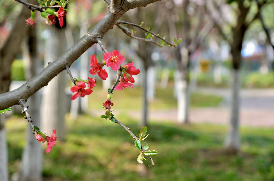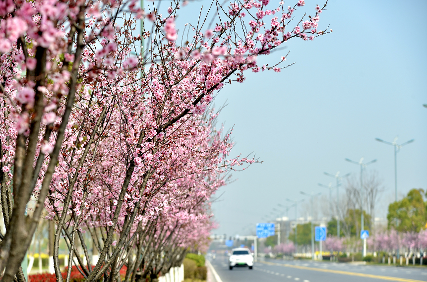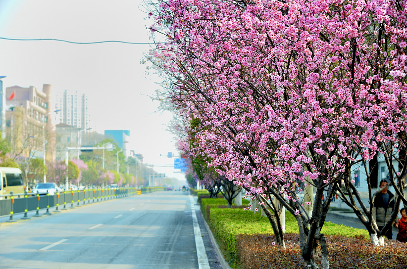 荆江路两侧,红叶桃缀满枝头,嫣红似霞,热烈明媚,尽显春日活力;