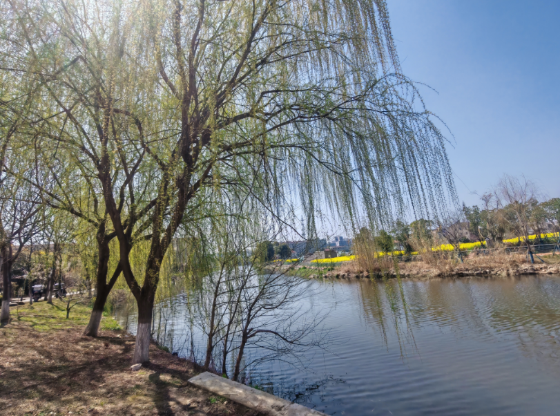 内荆河两岸,垂柳抽芽吐绿,柔枝轻拂,碧水垂柳相映成趣,尽显江南水乡温婉韵味;