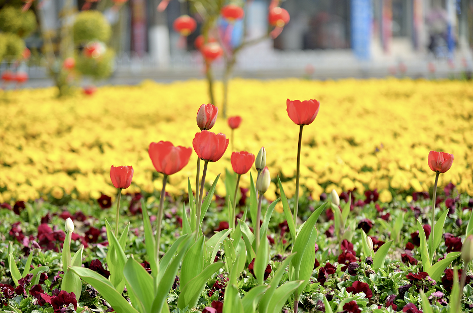 老六医转盘,郁金香缤纷盛放,色彩斑斓、娇艳欲滴,满目绚烂,点亮城市春日浪漫;