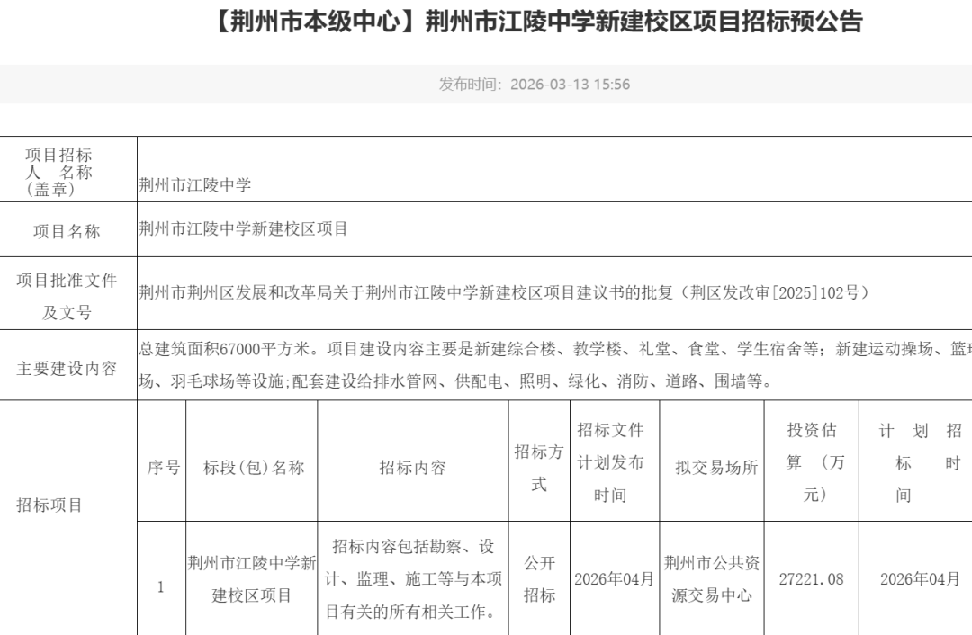 根据招标预公告显示,荆州市江陵中学新建校区项目规划总建筑面积达67000平方米,估算总投资约2.7亿元,计划于2026年4月正式开展招投标工作。项目建设内容涵盖多个方面,既包括综合楼、教学楼、礼堂、食堂、学生宿舍等主体建筑,满足教学、办公、食宿等核心需求;也包含运动操场、篮球场、羽毛球场等体育设施,保障学生体育锻炼需求;同时配套建设给排水管网、供配电、照明、绿化、消防、道路、围墙等基础设施,全力打造功能完善、环境优美的现代化校园。