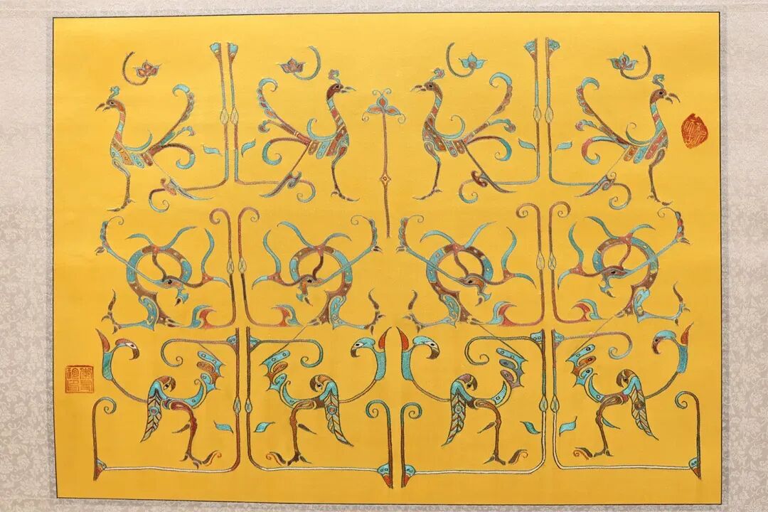 李友珍深耕构图创新,深入研究楚文化图腾、漆器纹饰,提炼楚文化神秘浪漫的艺术风格,巧妙运用对称、拉伸、变形等现代表现手法进行再创作,将楚文化魂魄融入绣品之中,让作品既有古雅韵味,又符合现代审美。