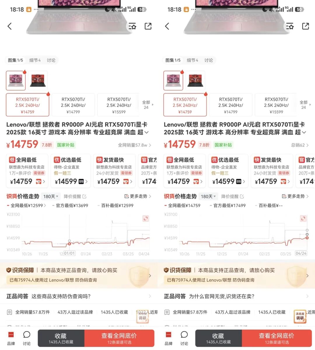 记者在某比价APP查询发现,多款热门笔记本型号价格波动显著。2025款拯救者R9000P AI元启RTX5070Ti 16G+1T型号,4月24日官方最低售价为17499元,而1月1日同款官方最低价格为13699元,涨价3800元;2025玩家国度ROG枪神9 RTX5070Ti显卡16G+1T型号,1月1日官方最低为13699元,4月24日已涨至14999元,涨价1300元,涨幅显著。